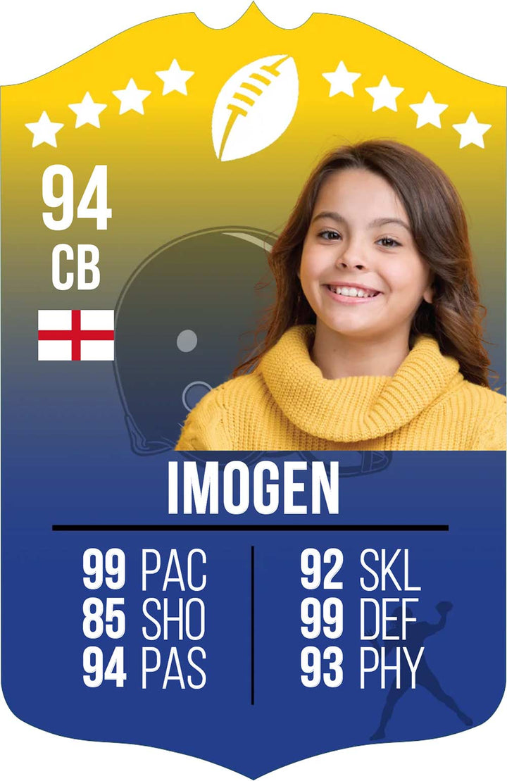 Celebrate your love for rugby with our Personalised American Football Card β€” the ultimate tribute to the sport's energy, toughness, and team spirit. Designed to showcase your custom image and player stats, this one-of-a-kind card is perfect for young american football fans, budding athletes, or as a standout gift that tackles the ordinary and delivers something truly unique.